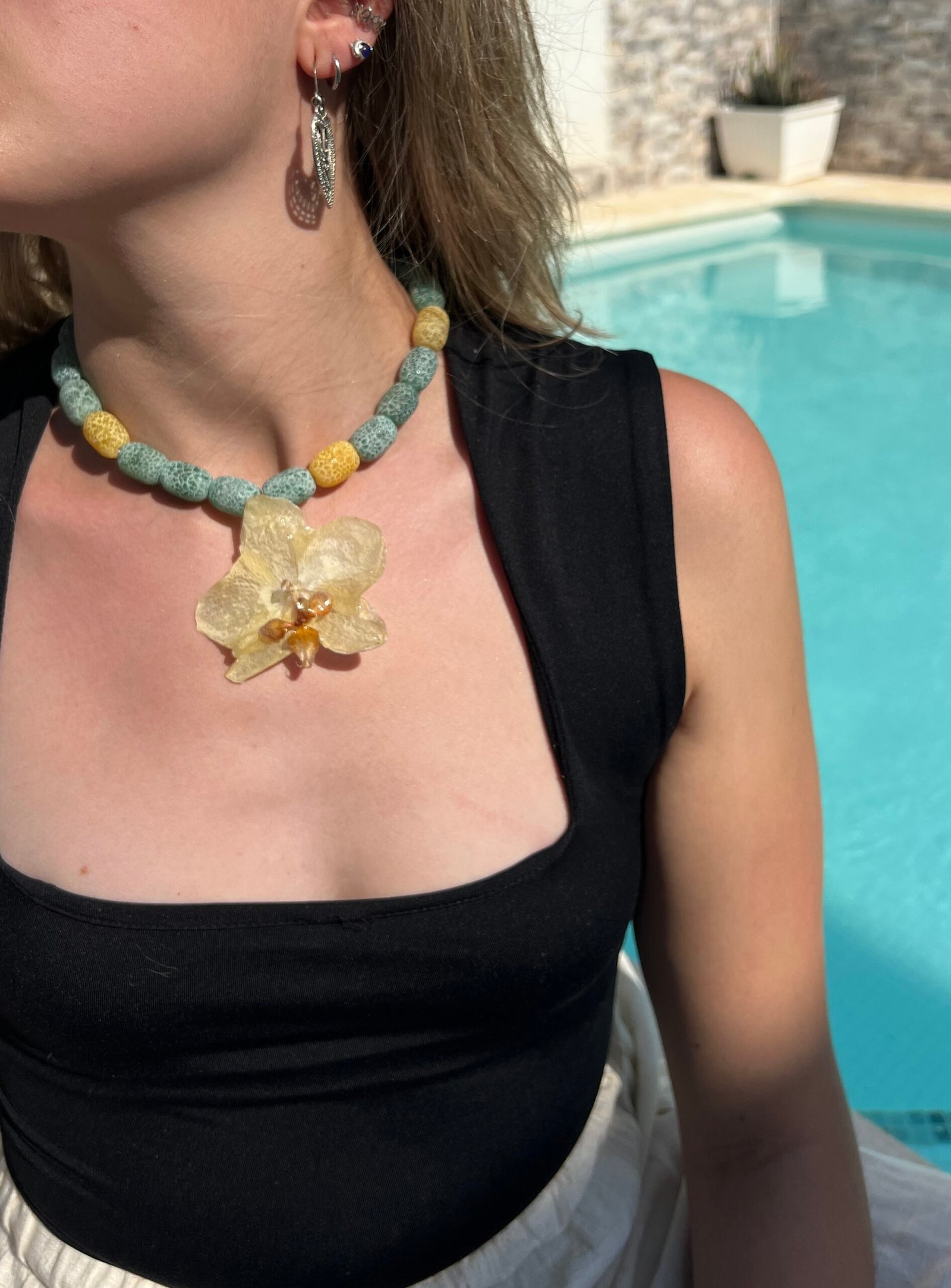 Collar artesanal con flor azul encapsulada en resina y detalles de perlas. Inspirado en el mar de Formentera, perfecto para un look fresco y luminoso.