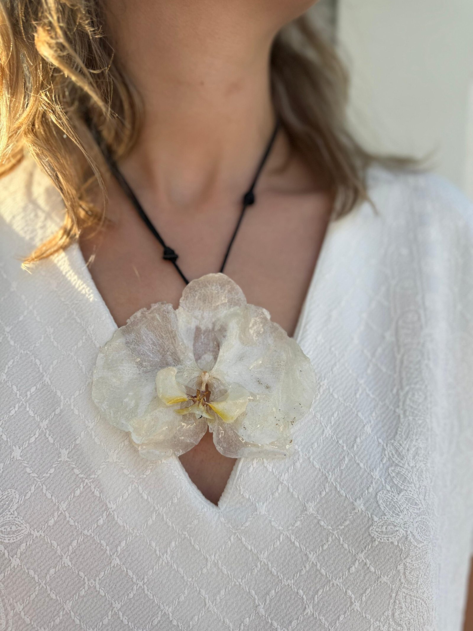 Un collar artesanal con orquídea blanca encapsulada, diseñado para acompañarte con elegancia en cualquier ocasión y recordarte que, a veces, la belleza más pura está en lo simple.